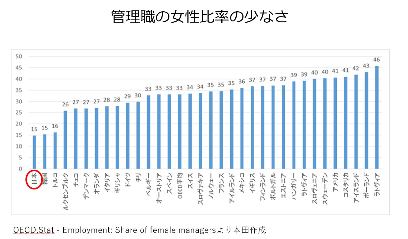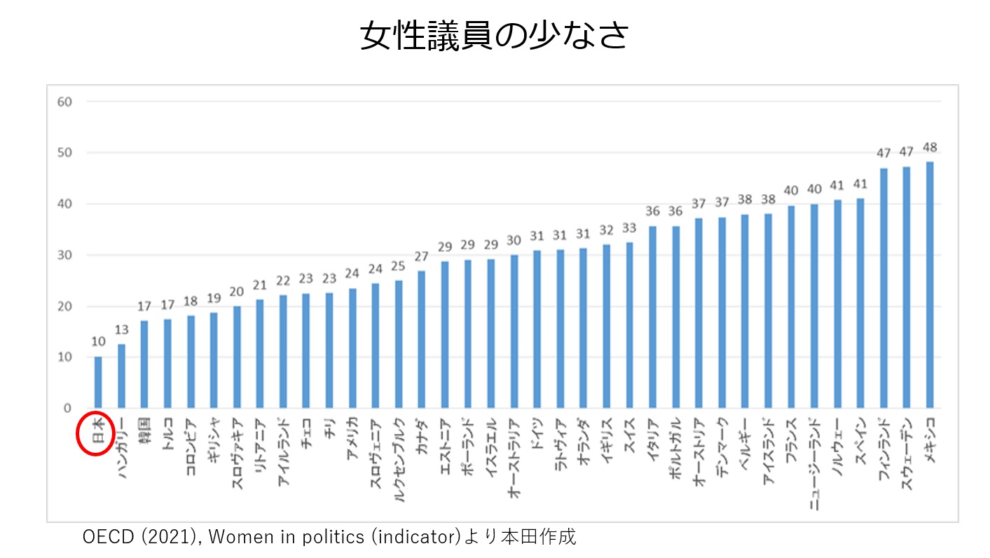 最低ですよ、最低。女性議員の割合。政治家、管理職など、発言力やお金を持つ地位に女性がついている度合いが日本はものすごく少ないです。
