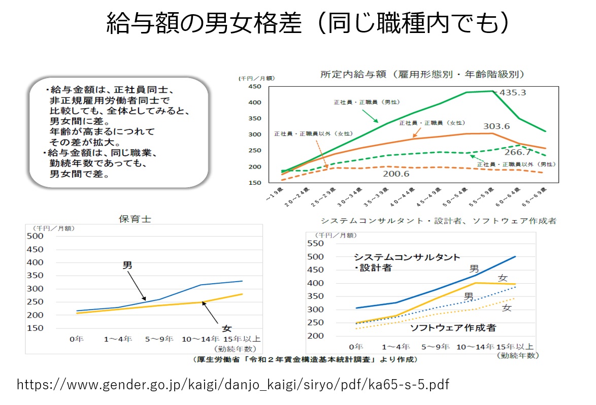 同じ職種で同じ正社員でも、女性の方が賃金が低い。微妙に担当している仕事が違うからです。いわゆる「性別職域分離」がある。昔に比べればかなり揃えてきていても、まだ女性が低い。揃える以前に、そもそも女性は非正社員が多い。