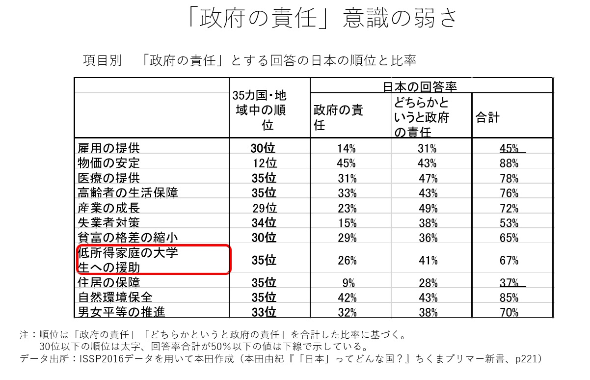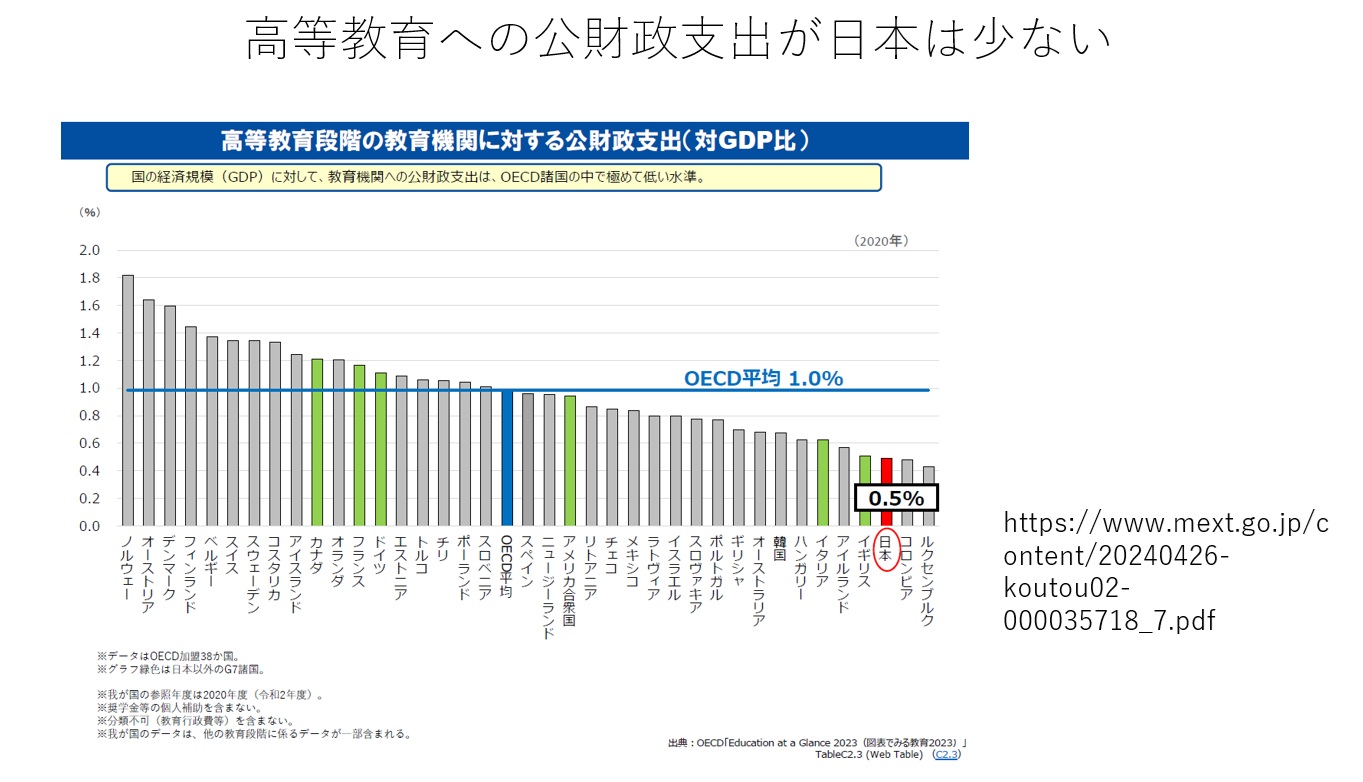 政府が高等教育に対してお金を十分払ってくれていない。その分、家庭や、あるいは家庭が払えなくて本人が苦しい思いをして払っている。政府は「受益者負担」、つまり「高等教育を受けたら将来給料が高くなったりして自分が得するんだから自分で払え」みたいなことを言う。