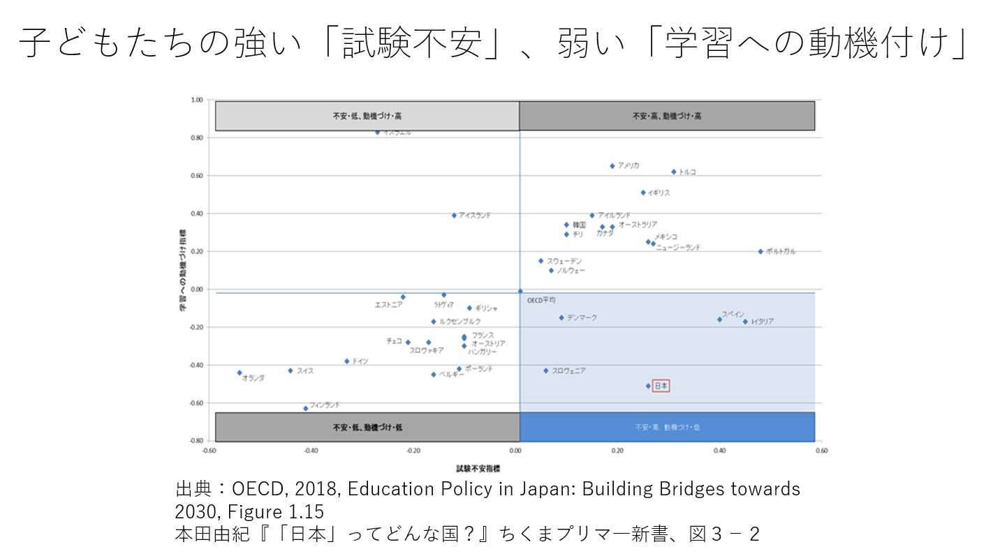 日本の15歳の子どもたちは試験への不安は高いです。学習への動機づけは低いです。つまり悪いとこどりをしてるような形で、ぴょーんと他の国から離れて右下にある。こういう教育をつくってきている。