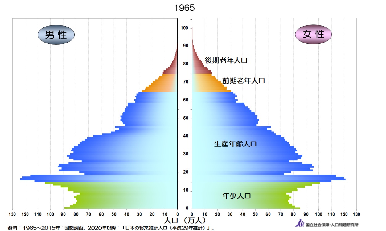 まさに戦後日本型循環モデルがぶんぶん回っていた頃。すんごいピラミッド型ですね。若い人が多い。高齢者は少ない。若くて安くてよく働く潤沢な労働力が高度経済成長を押し上げていました。これが1965年です。