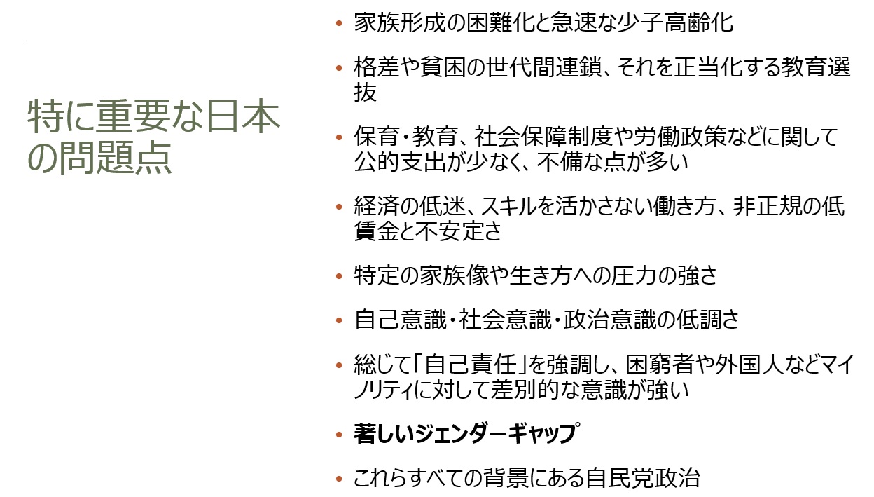保育、教育、社会保障政策、労働政策。全部大事なことなのに公的な支出が少ない。法律的にも不備な点が多い。