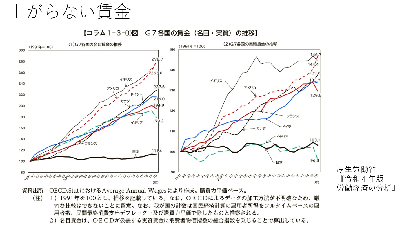 厚生労働省の白書のデータですから、お墨付きです。他の国は上がってますよね。日本はずっと低迷。