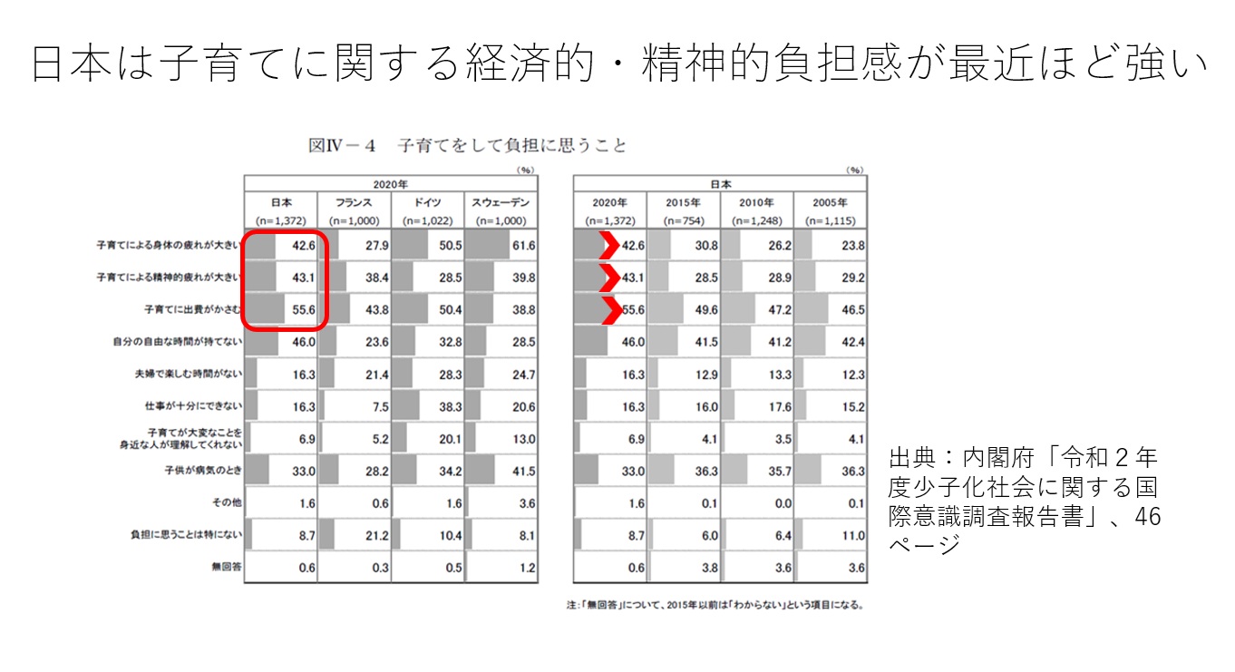 日本は子育てに関する経済的精神的負担感が他の国と比べて強いですし、最近ほど強くなっています。